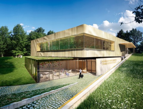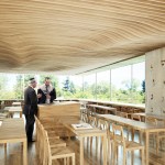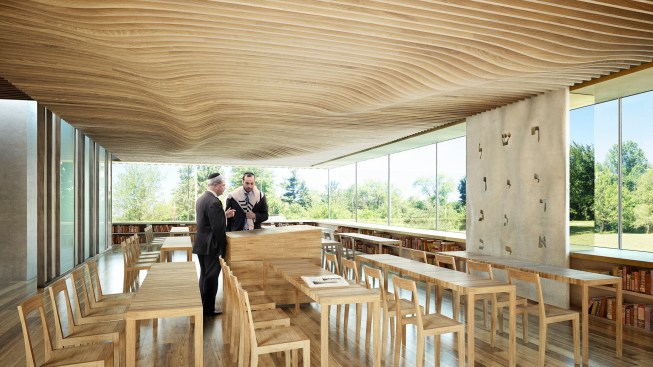 The overall building form is the result of a rotation in the upper programmed volume. This shift allows the Center to face directly east, optimizing the direction of daily prayers. This configuration enables the complex to appear as though it opens-up and reaches-out, similar to the role Chabad plays within the Toledo community. To further reinforce the inviting character of the facility, the façade treatment softens the building’s rigid form. It evokes a sense of change and gentleness via the interplay of light and shadow on its rippling wood-clad folds.