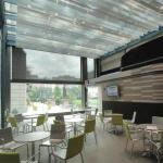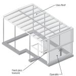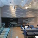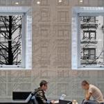 The focus of the renovation is the double-height social hub. The public spaces are highlighted by four primary surfaces whose design parameters are distinct. Marble Fairbanks defined different “performance” criteria for each that could be used to create digital patterns that relate specifically to different programmatic spaces. The design of the social hub’s ceiling is driven by “acoustical” performance; that of its west wall by “cultural” performance. The ceiling of the café takes its cues from “environmental” performance; its east façade from “dynamic” performance. The first three surfaces are metal panels whose elaboration employs digital design and fabrication techniques. For each, the designers chose appropriate images and wrote computer scripts that created perforated palimpsests of that imagery while simultaneously accommodating the surfaces’ structural, lighting, mechanical, and fire protection needs. The dynamic façade is an operable glass wall, which raises and lowers slowly, allowing access to an adjacent courtyard.