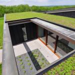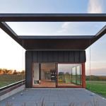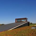 Set on 45 acres among the deep river valleys of Wisconsin’s Driftless Area, the Topo House takes its cues from the region’s distinct topography. The long, horizontal volume burrows partly into the ground, with an angled copper roof that gradually rises from the earth. Architecture and landscape merge in the small rectangular courtyards carved from the building bars. Black-anodized aluminum fins on the façade create a relief that evokes the wave patterns of the wind-blown prairie. Viewed at different times of day or from various angles, these fins create a changeable veil that alters viewers’ perceptions of the house’s geometric discipline. Inside, the functional spaces trace upward along five levels from the lowest-level entrance to an observatory that caps the 2,910-square-foot residence.