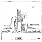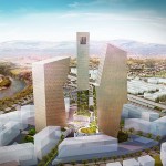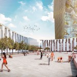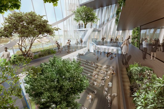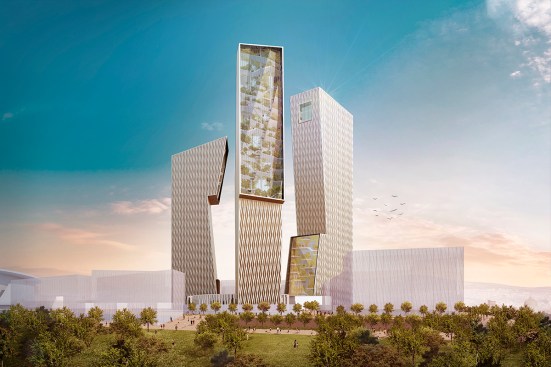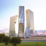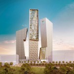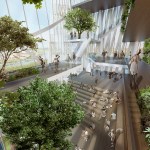 The three towers, which vary in height up to 220 meters, emerge from a three-story podium with a planted green roof that, at street level, will provide amenities such as cafes and shopping. The towers are clad in a web of opaque panels that breaks up the glazed façade and creates a unified aesthetic between the trio. Each tower exposes one or two massive glazed garden zones with multi-level open spaces for work, recreation and events. Planted with multiple green features including full-grown trees, the atrium-like spaces will provide spectacular, unobstructed views of the city and the central piazza, as well as enhance the room climate through natural shading, air filtering and circulation. The garden facades are shaped by folded glass planes. Tower One forms the centerpiece of the composition, featuring two vertical gardens on opposite sides, one on the lower half and the other on the upper floors. With a central core, the tower provides for efficient office layouts, while the deeper, multi-level garden zones allow for flexible, open work spaces.