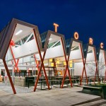 After several years of testing and establishing a design language embodying the Torchy's Tacos brand, mainly through the design and construction of interior finishouts and second generation remodels, Chioco Design was commissioned to create their new flagship location. The ground-up building, located along Austin's iconic South Congress Ave., is situated on the site formerly occupied by Fran's Hamburgers, an Austin based restaurant established in the 1970's that symbolized a nostalgia for the archetypal Texas drive-in diner. Chioco Design set out to create a building able to respect its iconic setting, allude to its historic roots and fulfill the needs of a modern restaurant.
