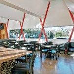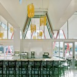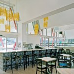 Encaustic cement tiles are thoughtfully used around the interior and exterior, even materializing as a flooring surface to distinguish the entrance and queuing area. Brightly colored custom fabricated light fixtures hover above both bar areas serving as a significant contrast to the white ceilings during the day and brilliantly illuminating the space at night. Half-height board-formed concrete walls, a staple of the Torchy's brand, serve to direct traffic and act as a compliment to the warm wood tones found around the space.