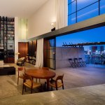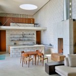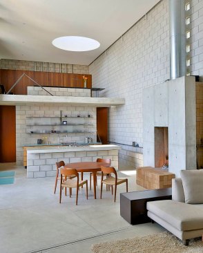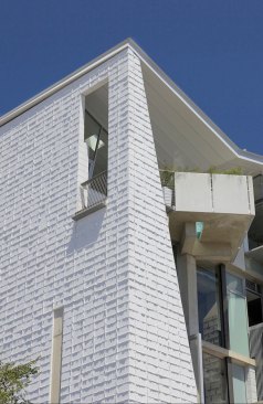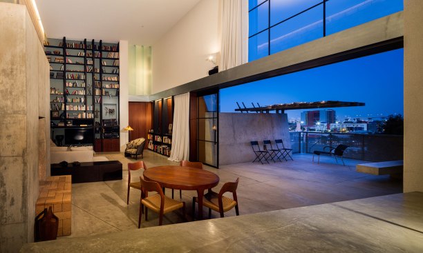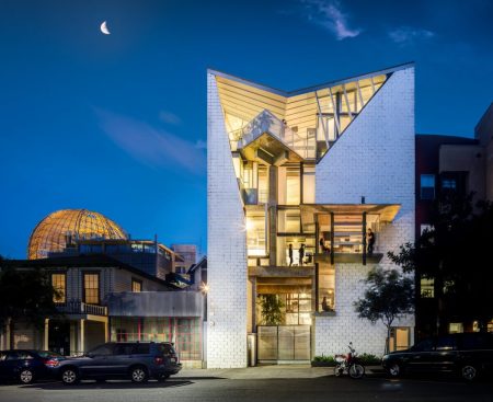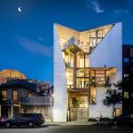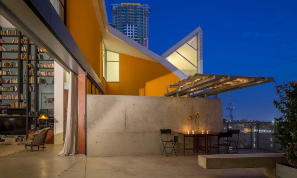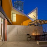 This five-story, zero energy mixed-use building sits in the shadow of the new Central Library and houses the Quigley Architectural offices. The “juicy joint” block is animated by San Diego’s bright sun and protects a series of balconies and bay windows meant to encourage an interactive “conversation” with the street. 42′ wide and constructed of fireproof materials, a penthouse rental unit perches above the offices and faces 13th street. Unusual in a dense urban situation, the top floor living/dining area has light from the ceiling and three sides allowing the path of the sun to continually alter the mood of the space. Archaic California and City laws prohibited logical grey water recycling.The unusual roof form provides the proper angle for solar collectors and guides rain water to the back of the site where it is channeled and filtered through gardens and stones before it reaches the street. The unique penthouse is the counterpoint that allows you to observe the city’s East Village below as it evolves.