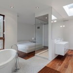 On the second floor the master bedroom is yet another manifesto of their style, with the ensuite and the bedroom entirely merged together and washed with natural light, the challenge was to define the wet zones without disturbing them with drywalls. Beautiful marble tiles separate the shower and the bathtub area from the rest of the hardwood floor. The freestanding bathtub installed in the corner of the room has a peaceful corner view to the courtyard.