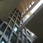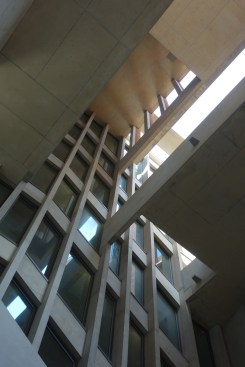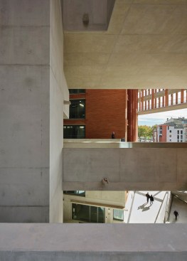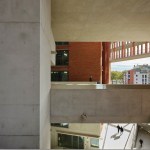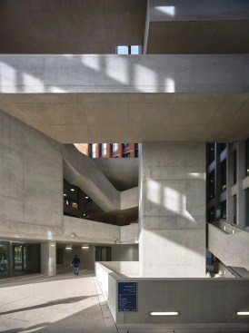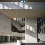 In order to provide places of research and education which are pleasurable to work in, we have devised a building strategy, where the individual office ‘bars’ are 10.8 m deep, thus providing natural air, light and ventilation to each office. Each office ‘bar’ is considered for its particular orientation and each given a particular profiled elevation to protect the rooms within. This methodology is also used at the large scale, where the ‘specials’ – for example, the Seminar Rooms and terraces- are strategically placed, both symbolically on the public / city wall edge, and to the south environmentally , allowing us to position these large volumes with very little fenestration, to act as a ‘deep wall’, controlling light, shadow and shade.