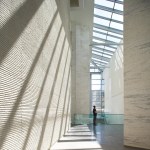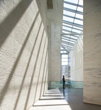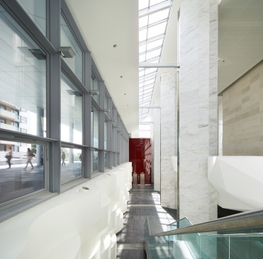 Three newly constructed volumes help integrate the building into its context. To the east, a horizontal roof announces the newly built entrance to the quartier. To the north, a new volume containing a brasserie and a café defines the fourth side of the orthogonal “Place,” while engaging the square. To the southwest, a new volume containing a multi-level food court and dining halls overlooks the Boulevard Circulaire.