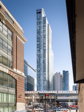 The 57-story rental is comprised of two connected segments: the soaring tower on 28th Street housing 451 residential units and a smaller building on 27th Street solely dedicated to amenities, including a pool, a fitness center, spa, sauna and yoga studio. The two segments are connected on the second floor by a covered breezeway and share a versatile roof deck that can be opened in summer months via a Nanawall to the pool in the amenity building.