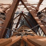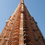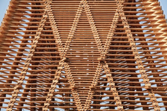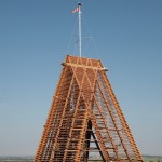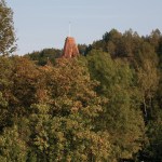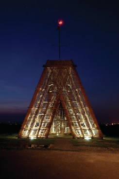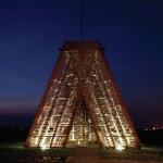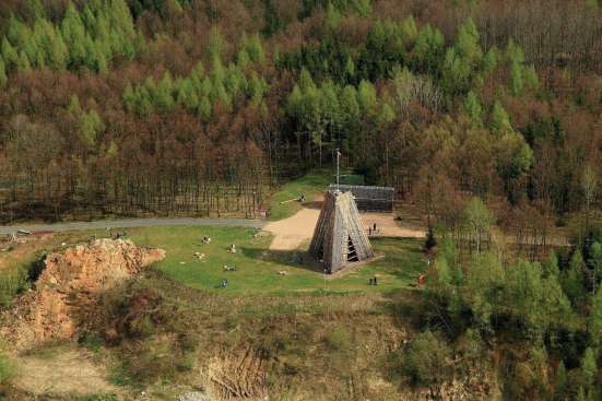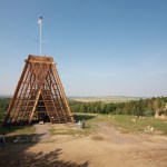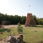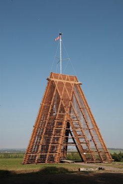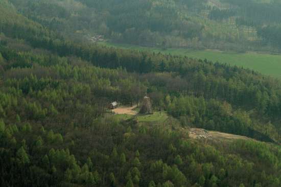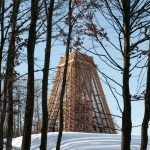 The history of the tower Bára has got all attributes of a dramatic story. Town council of Chrudim decided to build an out-look tower in the forest boundary, where the landscape provides beautiful panoramic view of the surroundings. An architectonic contest was made and as the winning project was marked the one by Martin Martin Rajniš from e-Mrak team. An out-look tower in the shape of truncated triangular pyramid, made out of larch planks with minimum number of fixed joints, secured by metal tow bars. Access to the view platform is provided by circular oak stair, which is fixed on the convulated steel pole rod in the middle of the tower. Upon the view platform is placed a mast made of steel tubes with flashlight on the top. Out-look Bára was festively opened for public on the 21st of June 2008. Unfortunately, a massive storms, with a power of tornado in some locations, swept across the Czech republic just four days later. One of them appeared at the region of Chrudim and caused irrecoverable damage to the new-built out-look. Whirlwind left nothing but a mass of wreckage a few meters from the place where the original out-look was placed. However, citizens of Chrudim did not give up and the decision to build a new one was made almost immediately. On the 3rd of September 2009 was the new tower – Bára II opened. This new out-look is pretty much the same as the previous one was. It is just slightly lower and built in a way to resist the wind with power of a cyclone (approximately 200 kms per hour, in contrast to the previous one, which was able to resist only 130 kms per hour). Bára II has also got more security components, including steel cables with tension varying each thirty minutes according to air moisture. View from the platform is usually the most interesting feature of the out-look, but Bara II has much more to offer. For visitors with interest in technics has to be pleasure to see the unique construction with number of simple, but clever details. Those, who are more into philosophy could use the wall of the tower as a source of meditation. Variation of horizontal wooden lines and gaps between them makes really delightful view. The structure reminds of water clarification and makes interferential optical effect, which is well known for its sedative action.