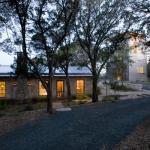 The old 1930s stone cabin serves as the living room, while the new adjacent tower contains the bedrooms.