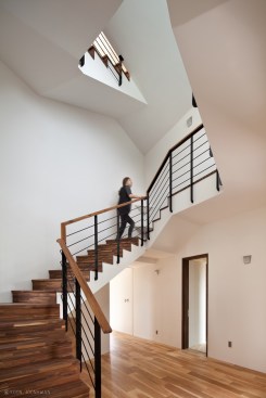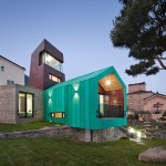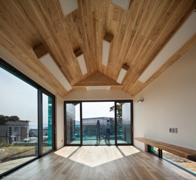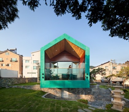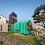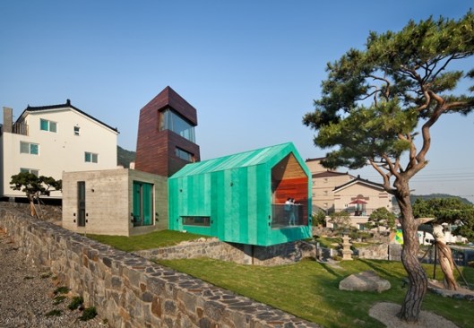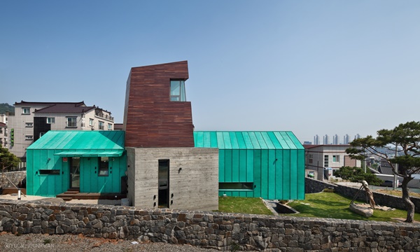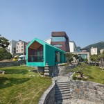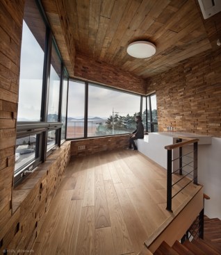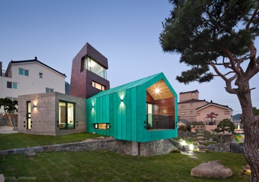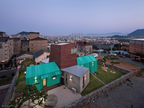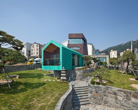 The site is located in a housing land development area behind Gimhaehyanggyo Confucian School. The client purchased the site just because of its fascinating view over the cityscape of Gimhae, and wanted to build a house. However, unfortunately when he was eventually able to start the project, multi-household houses were already on construction around the site, and as even more houses were planned to come, thus the site environment seemed to come up with a different scene which betrays the client’s wish. Nevertheless the architect tried to do bring the cityscape of Gimhae that had captivated the client’s mind, into the new house. Therefore, as a solution, he introduced a concept of observation tower in a form of family room. And also, inspired by the hobby of client; collecting ornamental rock and pot-planting, the architect created a foyer with a vertical gallery connected to the tower. The foyer presenting another distinguishing feature to the house, works as a communal space linking and integrating all the individual rooms. And the vertical gallery provides an exhibition space with a circulating route for ornamental rocks and pot-plantings.