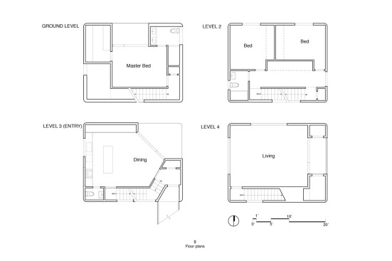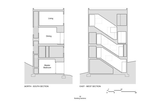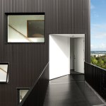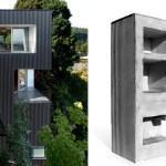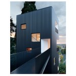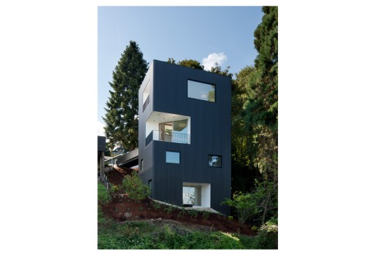 The design of the Tower House in Portland, Ore., starts with a four-story tube, from which sections on each floor are carved to form loggias with expansive views. The hillside site had been deemed unbuildable, but Waechter Architecture devised this vertical solution, which features one primary program on each floor—dining room, living room, and two floors of bedrooms—in order to minimize the house’s footprint and foundation. A steel pedestrian bridge connects the third-floor entrance to the top of the hill. The house is clad in black corrugated steel and has rounded corners that dispensed with the need for corner trim. In contrast, the interior features white walls and oil-rubbed white oak floors and finishes.