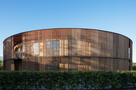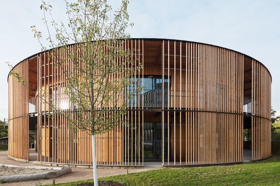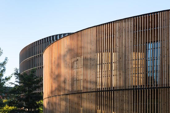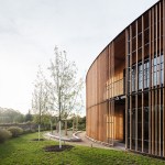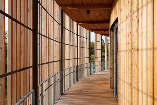The visual appearance of the two buildings is impressive—the facades feature locally sourced larch wood elements. The facade of the town hall has been constructed using staggered, vertically projecting modules with photovoltaic cells and high-quality thermal insulation. Story-high glazed facade elements are used to optimize the intake of daylight. The facade of the circular day nursery building features narrow strips of vertical timber cladding and large openings with balcony doors, as well as an access balcony at second floor level. The openings have been placed to provide daylight and vistas to the outside while also offering direct access to the building.