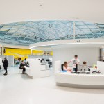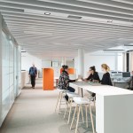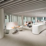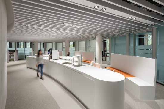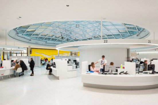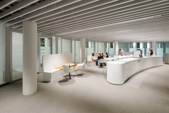 The citizens’ service center with its 100 employees offers citizens general and advisory services. All offices and workplaces have been designed for functionality, openness, and working in a flat hierarchy, whilst providing privacy and security. Overall, the spaces appear generous and flowing thanks to their rounded shape, and ensure easy orientation. Large rooflights provide plenty of daylight and offer good vistas to the outside. The downlights in the white perforated ceiling panels have been arranged in seemingly random fashion to create the impression of a “star-studded night sky”. The advisory points are subdivided into four large rotundas, each of their centers being formed by a circular retreat room. The layout of the segmental arch-shaped desks follows a concentric pattern, with vertical acoustic panels used as dividers. To create privacy between adjoining advisory points, 160 cm high visual screens are installed that replicate the round design pattern of the rotundas. A piece of wall art by the Berlin artist Schirin Kretschmann in the midst of the spatial arrangement forms an omnipresent element and the “spine” of the space.