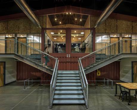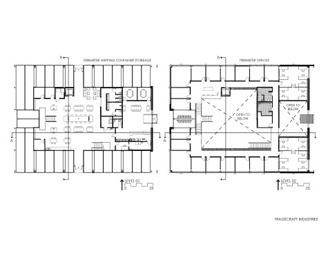 Conceptually, Tradecraft Industries was designed around the idea of multi-use. By selecting multiple-use building components, systems, and materials the concept allows for cost and labor efficiencies while offering flexibility and streamlined construction. A layering process was designed to maximize multi-use components. This process starts at the building’s base, created from shipping containers, setting the foundation and boundary for the building. The containers function as storage that members can access from outside the envelope, the structure of the second floor, a central conference room with views of the Rocky Mountains, and entry portals to the building. The base is then wrapped with a pre-engineered metal building. Continuous ribbon windows, maximizing the structural nature of the lightweight envelope, provide views out and let daylight in.