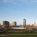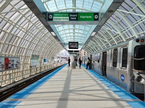The CTA Cermak/McCormick Place Green Line station serves the country’s largest convention center which was station-less since 1977. The innovative design, a tube covering the platform and tracks, is a response to the narrow right-of-way, a minimal platform, the need for low-maintenance materials, and the creation of a “gateway” to welcome visitors to Chicago.