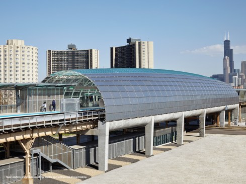 The polycarbonate and stainless steel enclosure maximizes rain and wind protection while providing light and views. Translucent panels are provided directly over the platform. Perforated shingles form the sides of the tube. The shingles are attached with a specially designed clip allowing replacement of individual shingles for ease of maintenance. Four perforation densities with up to 23% open area are used to deflect rain and wind while allowing summer ventilation. Perforation densities are arranged to maximize views over Cermak Road and to protect from prevailing winter winds. Slight entasis at the center of the tube emphasizes and celebrates arrival and gateway.