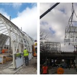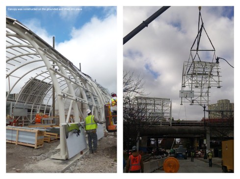 To maximize the limited platform, canopy and windbreaks were combined into a single element, supported on a new structure independent of the tracks. The bent pipe structure was assembled on an adjacent site and lifted into place during low traffic hours to minimize train disruptions.
