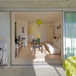 On the other side, a lightweight façade of transparent, corrugated polycarbonate panels and glass in aluminium frames is assembled and equipped with reflective solar curtains. Glazed hand railings run along the balconies.