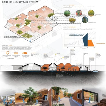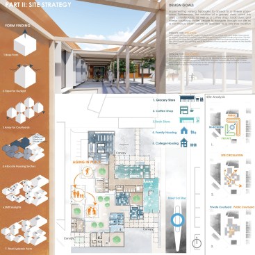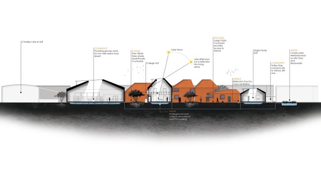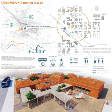By integrating the Architecture with Tucson’s climate through the tapering form, and by introducing site-specific ecologies as well as the implementation of public courtyards, the user’s health and wellness will be improved through the promotion of social interaction in the community. The architectural proposal contains 6 college housing units, 3 single family housing units, a grocery store, a coffee shop, and a book store totaling at 18,500 sq.ft.