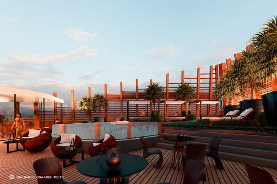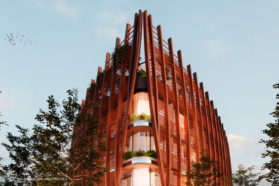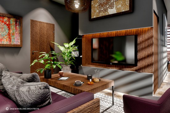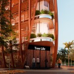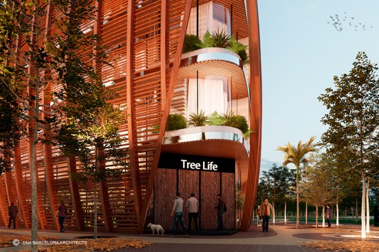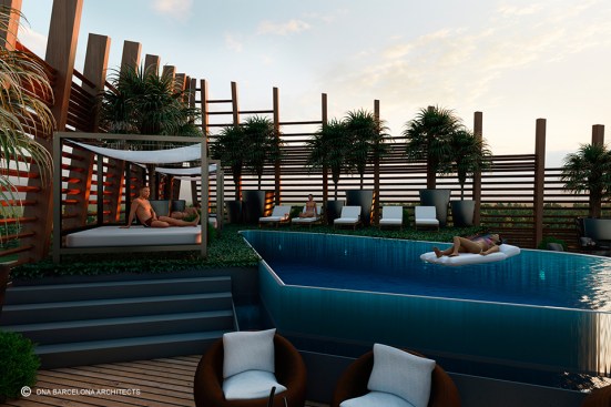 DNA Barcelona Architects presents “Tree Life Boutique Hotel, Aldea Zamá, Tulum, Mexico”, a new project for Giada Real Estate, inspired from the Nature patterns- wooden façade and lots of greenery inside. The hotel represents a solid triangular building with the surface of 1.652 m2 with big panoramic windows all along the complex, covered by a uniquely developed tree structure which creates an interesting game of shadows and at the same time gives a feeling of protection to its guests.