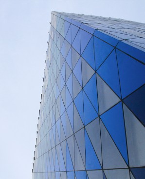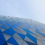 The name of the building is derived from the visual complexity of the facade. To tessellate is to repeat a pattern so as to create a plane. The unit chosen here is the triangle, the proportions so chosen for the ability to extract exactly four equal four-foot side pieces from a single 8×4 sheet. Apart from the longevity, the idea that material must not be wasted is a key component of our approach to sustainability. While the glass panels may appear randomly sprinkled, their positions are the result of interior daylighting requirements. The colours of the panels themselves have been chosen for better light absorption at lower levels, with higher levels of reflectivity closer to the top of the building. A tubular aluminum frame supported on robust metal brackets underpins the facade. Diagonal cross bracing support the glass and aluminum panels on the peripheries, creating the precise six sided joints.