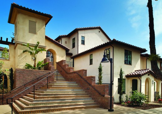 These two adjacent sites consist of 99, newly constructed two and three bedroom homes, and are anchored by a neighborhood-serving retail space, public art sculpture, childcare facility, Management/Leasing and Resident Services Building, all at the major street intersection within the community. The perimeter of the site is aligned with townhouses, which provide direct street access and orientation, obscure the secure car parking structure, and disguise the buildings bulk and belie its density. Grand staircases lead residents and visitors from the street up to courtyard-oriented townhouses, landscaped walkways, tot-lot, BBQ and sitting areas as well the Resident Building, which includes community kitchen, computer lab, multi-purpose rooms, outdoor living room, fireplace and common laundry facilities. Open retail and guest parking is provided to ensure visibility and ease of access. The architectural character is an interpretation of the Mission Revival Style, which evokes a heightened sense of urbanity and relationship with nature through the subtle use of smooth planer walls, recessed widows and delicate detailing. Its acceptance by a skeptical neighborhood was crucial to ensure the City’s long-term commitment to re-development in the area and upon completion and has become the centrepiece for the City’s overall Master Plan.