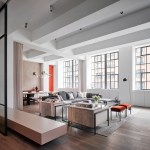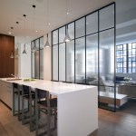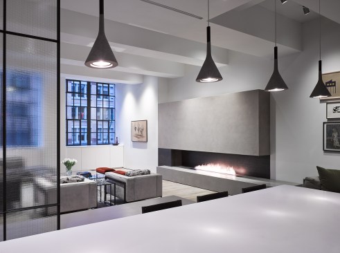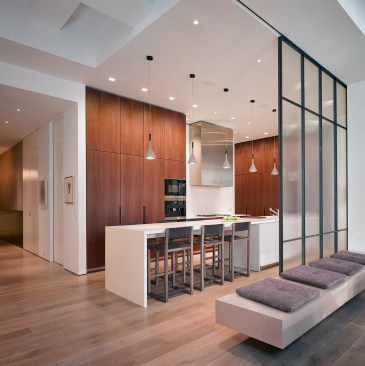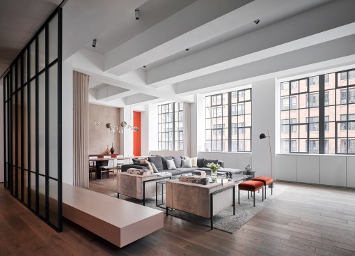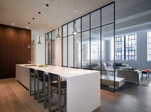 This Tribeca apartment was gut renovated to maximize space with a modern design that is in keeping with its industrial history. The layout balances large, open, loft-like spaces with gently divided rooms—achieved, for instance, with factory-inspired steel-and-glass partitions that belie their substantial weight by sliding easily on suspended tracks.