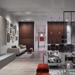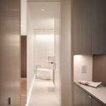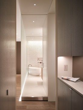 The custom kitchen hides a full walk-in pantry behind it. The walls throughout the apartment terminate in an elegant, minimalist reveal, a detail that would look shoddy without perfectly executed construction.