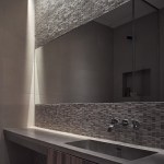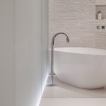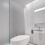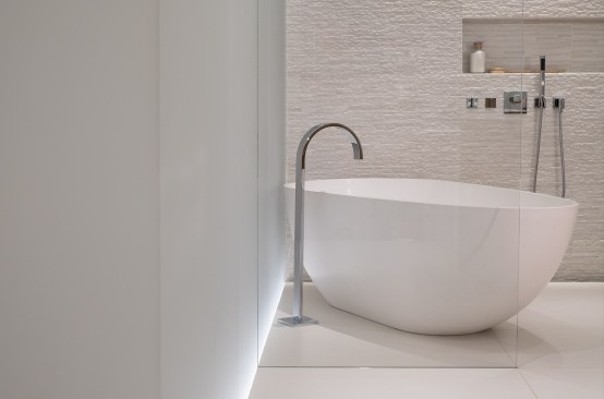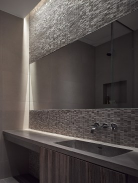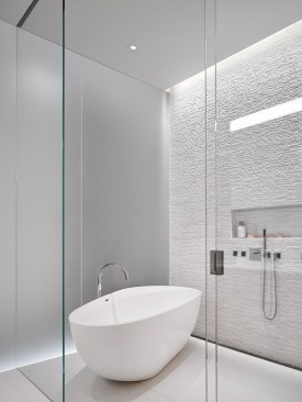 The master bathroom features a floor-to-ceiling glass wall, which meets the adjacent tile and plaster surfaces with no visible trim. To maintain an uninterrupted flow of tile, glass, and woodwork, all outlets and other devices were cleverly concealed.