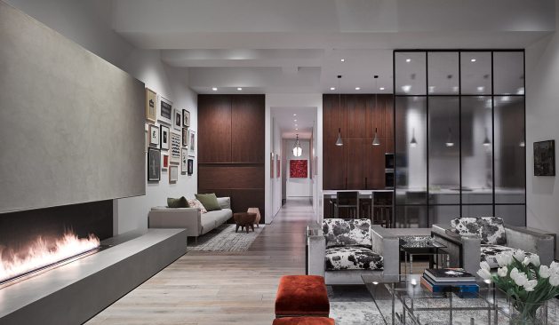 A subtle decorative plaster finish provides texture and mass to the custom-built fireplace. Reclaimed barn wood flooring softens the modern edges of the apartment.