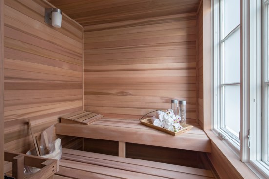 It’s easy to imagine the cozy night at home with a wood burning fireplace. The dining terrace with a built-in gas grill could kindle thoughts of summer entertaining. With Terra Mai Teak 6″ wood floor planks, Novelda Crème limestone walls, a teak tub deck and separate sauna and steam rooms, the master bathroom offers the prospects of personal indulgence after a stressful day at work.