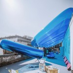 The Blue Sky Blues are situated on a roof terrace along Suzhou’s Guanqian Street. Through a group of blue transparent inflatables, a light and airy roof is formed over the terrace. The installation highlights China’s continued quest for more blue sky days throughout the country as it tackles air pollution, giving shape to this shared ambition.