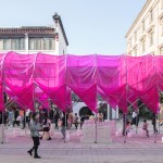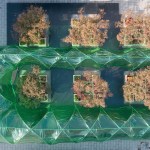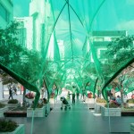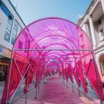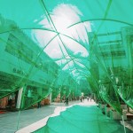 The modular platform, and the circular walkway formed by intersecting arches covered with a green semi-transparent canopy, wraps around a group of six small trees, part of the existing plaza, providing both an open and introspective colorful space. Under the circular walkway light passes through the green film, creating a diffused atmosphere that changes the usual perception of Suzhou’s streetscape.