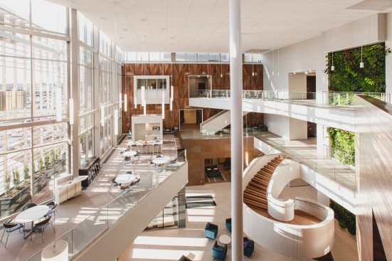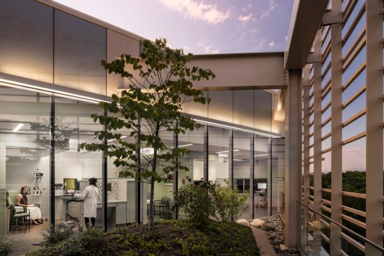 The Thomas Center brings specialists and services for heart, imaging, and cancer care together in a facility that will also house the Mary Jo Cropper Family Center for Breast Care. Organized around an airy and light-filled central lobby, positions nature as a partner in the health and well-being of patients and staff.