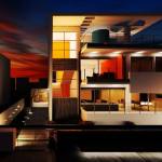 All the five facades of the construction (including the roof garden and the “blind” eastern facade) are composed of the absolutely necessary elements. The main components of the construction are clearly distinguishable from the secondary ones. The framework is freely displayed and contributes actively to the organization of both space and the facades. Symbolically, the exposed framework testifies the way the structure stands. Strong coloring on small selected surfaces also works to highlight the structure.
