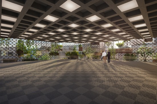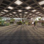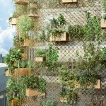 This façade design came from an idea of placing various plants and trees in random positions on the building’s elevation. A three-dimensional steel lattice covers the entire building volume to hold the planters. Each lattice unit consists of six steel rings, and forms a module with a cubic dimension of 400mm. The depth of the steel lattice casts formless shadows inside the building, occasionally punctuated by the stronger shadows of the scattered plants.