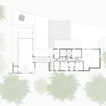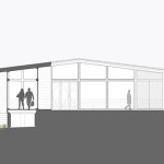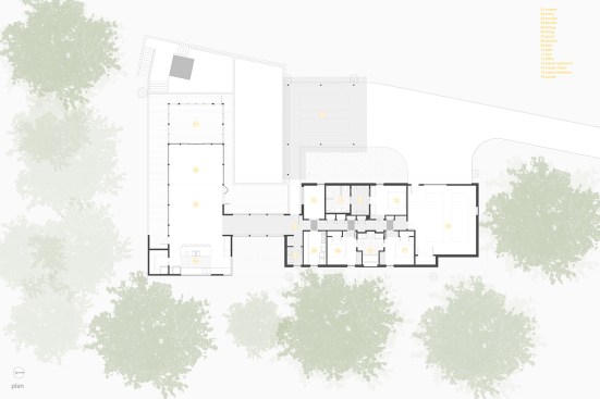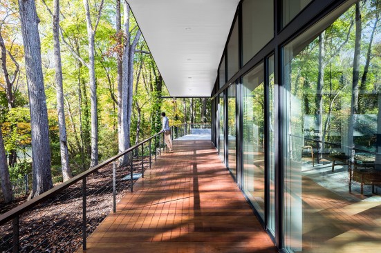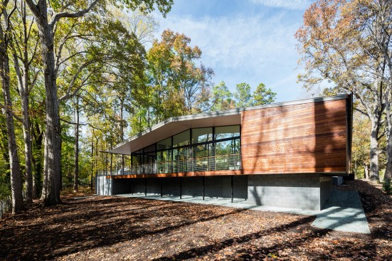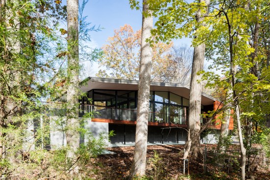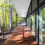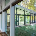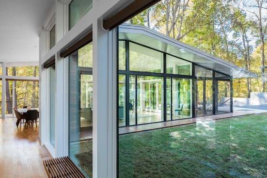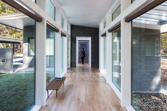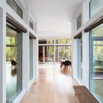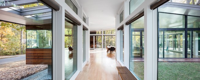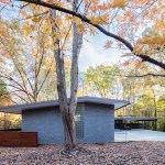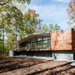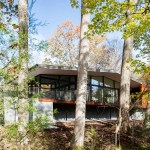 The Trull Residence is on a small corner lot in the suburbs. The lot is long north to south, with driveway access from the north and southern views of a forest and pond. The main view of the house from the street is from the east. The house is divided into two pieces – a solid sleeping volume and an open living pavilion – connected by a glass entry hall. A walled lawn, patio, screened porch, and south-facing deck surround the living pavilion on three sides, forming a network of private outdoor spaces overlooking the forest and pond.