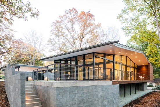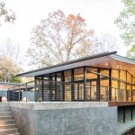 The house and outdoor spaces are built on a concrete foundation with CMU foundation walls. The bedroom volume is framed primarily with wood, and the living pavilion is made primarily of a steel frame. The roof is broad and thin, with four-foot eaves tapering to a six-inch fascia. The grounded bedroom volume, exposed foundation walls, and site walls are clad or formed with a burnished CMU, making them appear very solid. The lifted living pavilion is glass and wood, resting atop the constructed landscape and surrounded by CMU site walls. The house was carefully dimensioned so that no CMU blocks were cut during construction. Though the site falls nearly nine feet from the driveway entry to the southern end, the drive, carport, entry walk, walled yard, patio, southern deck, and all interior spaces are at the same level.