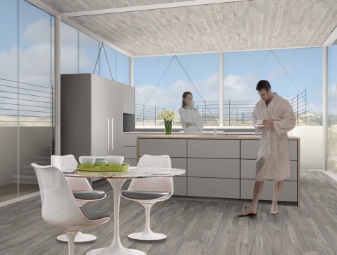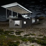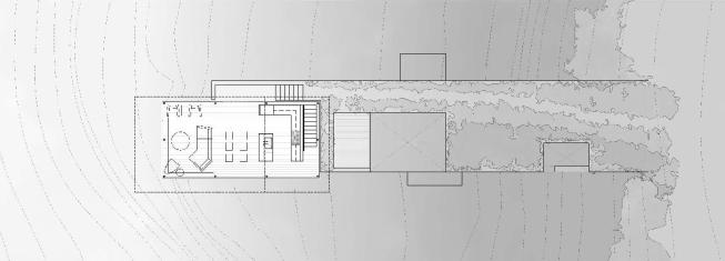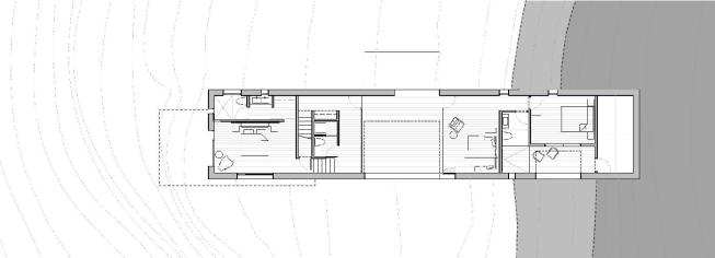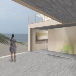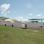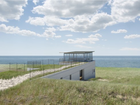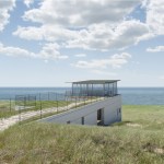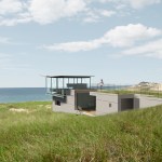 At a comparatively modest 1400 SF, the Dune House allows shelter and accommodations overlooking the beach and consciously does not compete with the Hopper House for high ground or stature. It is frankly, even starkly modern, evoking the very sense of isolation that Hopper celebrated and documented in this landscape. The house is composed of a concrete base, partially submerged into the dune, with interwoven indoor spaces and outdoor terraces cut into its south-facing façade. Approached from the land side, it is entered through lower courtyards, or by roof access to the glass living pavilion hovering above. The roof of the plinth is planted as a continuation of the existing context of native bayberry.