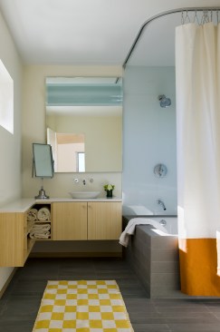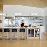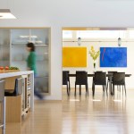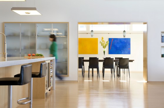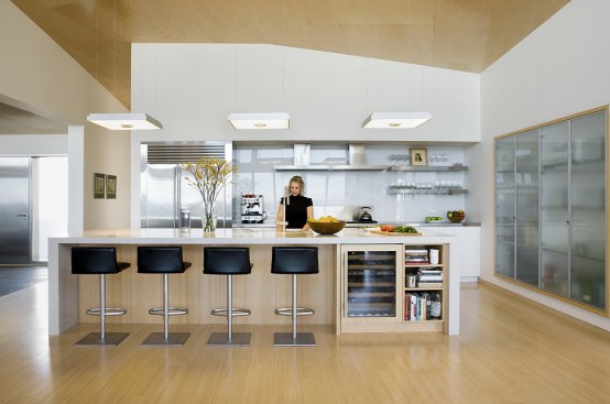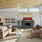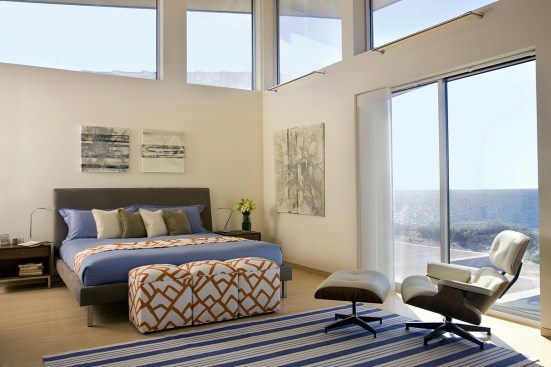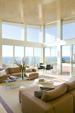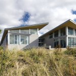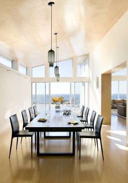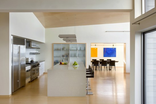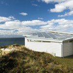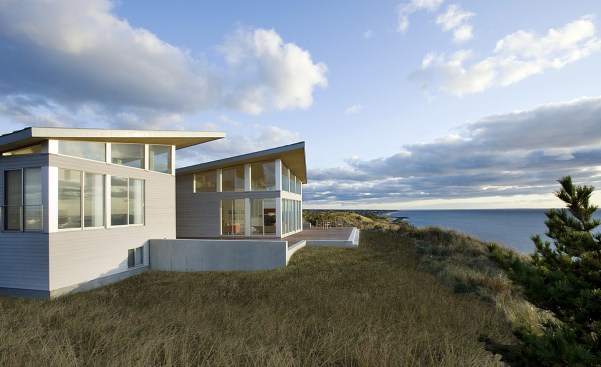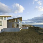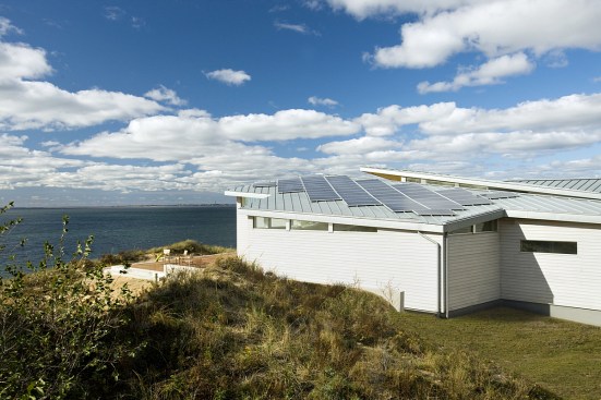 Environmentally sensible Cape Cod beach house. This modern, oceanfront vacation home, perched 115′ above sea level overlooks Cape Cod Bay. Inspired by the coastal topography, ZED designed the house to hug the dunes, then expand towards the water to capture the majestic ocean view. The high performance home features a super-insulated building envelope, geothermal heat pump, and solar electric system. As a vacation residence it accommodates a variety of occupancies for a large family. The home is split into two columns- a ‘living bar’ and a ‘sleeping bar’. Half the home can easily be decommissioned to save energy. The Living Bar includes the kitchen, living and dining areas, as well as a secondary master bedroom – all that the couple needs when the children are away. The Sleeping Bar is the expansion module with numerous bedrooms and bathrooms to accommodate the entire family. Photos by Eric Roth.