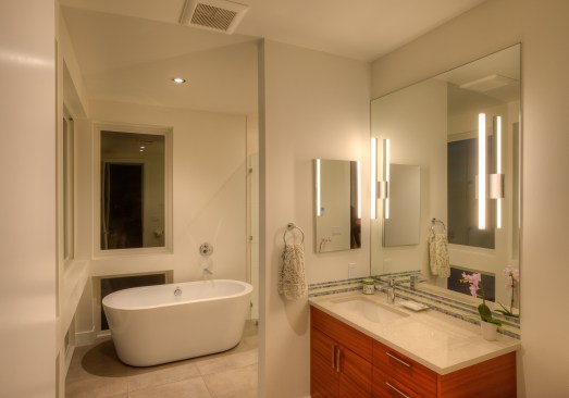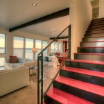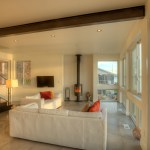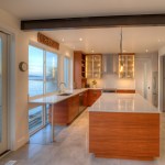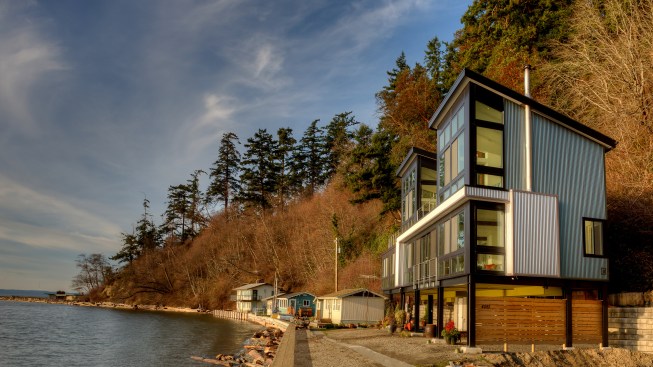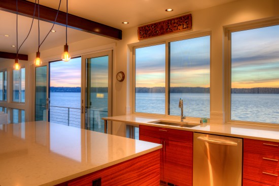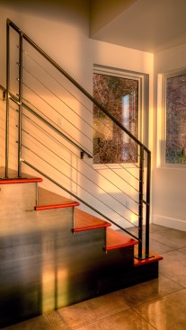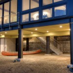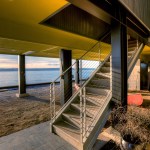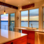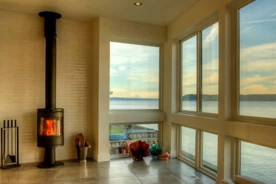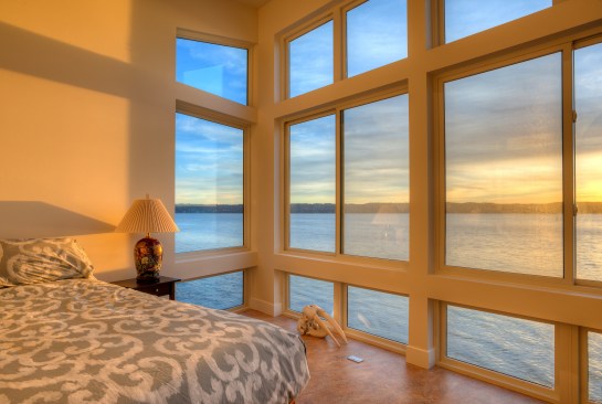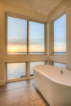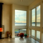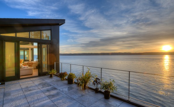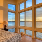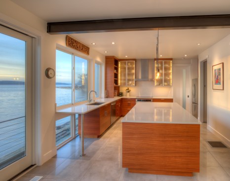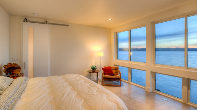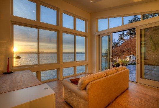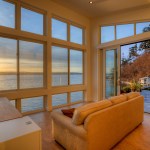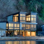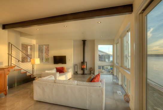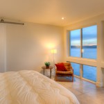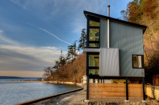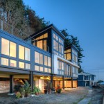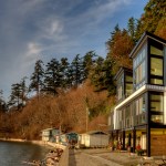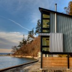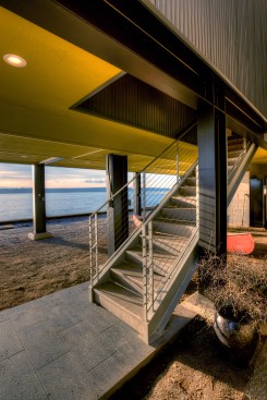 The west elevation of both floors takes advantage of floor to ceiling glass to open up views to the waters of Saratoga Passage. The east side of the house faces into the steep slope and this is addressed with more opaque walls with limited windows giving selective views of the vegetation beyond. The home is clad with metal siding to withstand the harsh weather of its coastal environment.