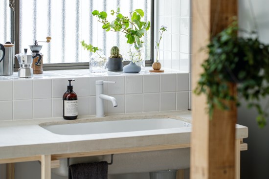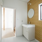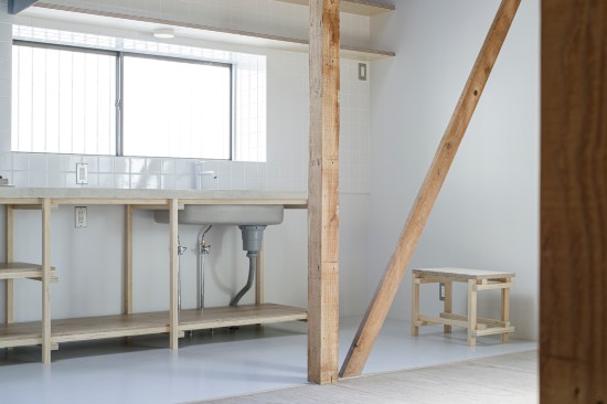 The kitchen wall is covered with the ordinary 10x10cm white tile which became popular in Japan starting from the XX century: while being an affordable and reliable material, it provides a cosy atmosphere by reflecting the light incoming from both horizontal and vertical openings. The ceiling window, in particular, has been simplified in its shape and fits now more with the structure and the surrounding walls.
