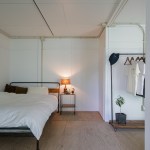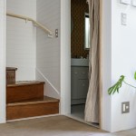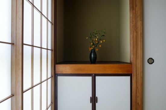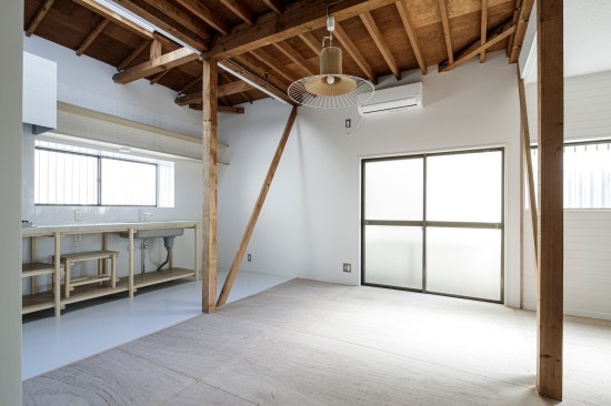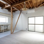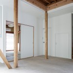 Because of that, the whole floor plan managed to increase its amount of natural light. The Japanese-style room next to the entrance hasn’t received any change, with all the original elements still in place. This creates a nice distinction from the calm tone of the traditional ambience to the bright modernised space remaining. This contrast has been enhanced also vertically by the exposed ceiling of the living opposed to the flat one of the tatami room.