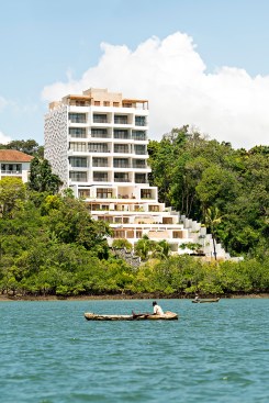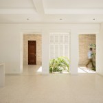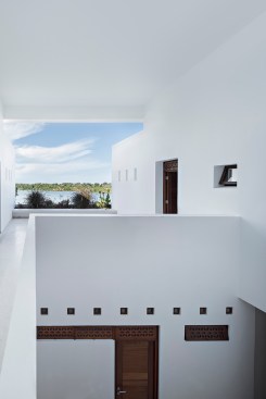 In addition to white, plaster finishing, the project uses mtomo finish, a coral stone cladding technique original to Lamu that helps keep thermal capacity thanks to the porosity of the coral stone. Wood work was realised entirely thanks to outstanding hand carving by local artisans from Mombasa and Lamu. Furthermore, artisans produced in situ terrazzo for the flooring of the patio houses.