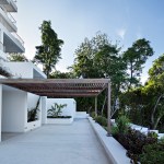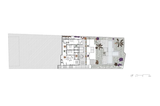 In the distinct bottom houses, the patios allow double ventilation: wood lattices allow air to circulate from the seaside through the interiors and to the patios; two superimposed lattices allow ventilation for both the house and the false ceiling, to avoid it transmitting heat from the sun on the top terraces. Moreover, vegetation is integrated in the patios and on the terraces, offering freshness and greenery.
