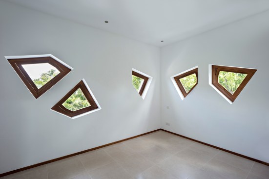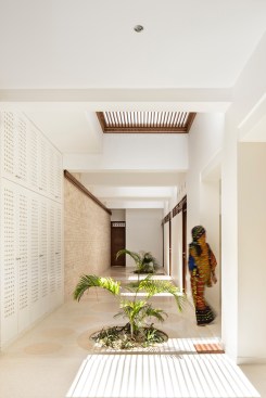 Spatially, this skin also redirects people’s local tendency to put bars on their windows, becoming itself the border and the filter. Sometimes the direct limit of the internal house spaces, the shell is at other times a first filter of sunlight and heat, doubled by internal handcrafted wood-lattice shutters. In this way, light is generous and heat is broken down.