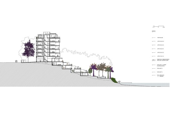 The plot’s slope and its narrow shape guided our design to minimize the building’s impact. The steep drop towards the creek, on the lower part of the plot, was saved with three distinct and unique patio houses, stepped one into the other. On top of filtering light, the patios allow ventilation via permeable wood lattices facing the water. They are accessible via lateral stairs that descend towards the creek, passing by an integrated gym at the bottom, and arriving to an infinity pool. A measured distance from the neighbours and the road give the building a well-weighted impact, for it to be present but not overwhelming in the scenery. This way, the apartments block, enveloped with its protective skin, rises facing the road, overlooking the creek, and topped with a penthouse.