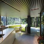 and thin skylights in the linear wood-batten ceiling showcase the tree