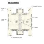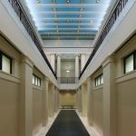 The building is organized around a central, two-and-a-half-story-tall atrium that bisects the building into east and west wings. The allocation of uses is clear: On the first floor, the Social Security Administration is on the right, jury assembly is on the left; upstairs, the FBI and Sen. Shelby’s offices are on the right, and the courts and judges’ chambers are on the left. Public stairs on either side of the entrance quickly access the chambers of the U.S. Judge and the senator, while centrally located elevators and a double-run stair lead to the second-floor courtrooms and other offices. The 165-foot-long atrium is relatively narrow on the first floor—only about 11 feet in width—but expands to 33 feet on the piano nobile. It’s the second floor where the building’s Classicism really sings—with Ionic columns flanking spaces in each of the cardinal directions and 16 panels of public art that tell local history in an accessible, realistic style.