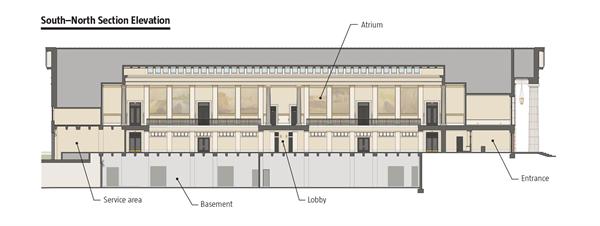 Another important consultant for HBRA was sculptor Kent Bloomer, who worked closely with the architects to develop the building’s ornamental details, including the acroteria and the ornamentation at the eave. “It’s classical, but it’s conventionalized,” says HBRA principal Dennis Rupert, FAIA. The roof is brushed aluminum, a relatively inexpensive but durable material in Tuscaloosa’s climate. “Kent worked out the details based on the techniques of fabrication, transforming the ornament to integrate the materials.”